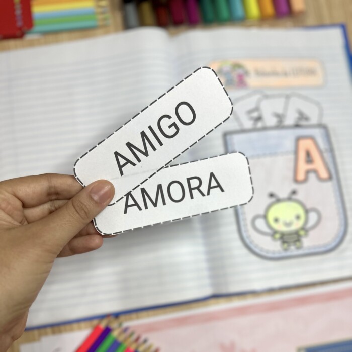 As imagens são para colorir, e cada bolsinho acompanha 5 palavras iniciadas com a letra representada, sendo a maioria de silabas simples.