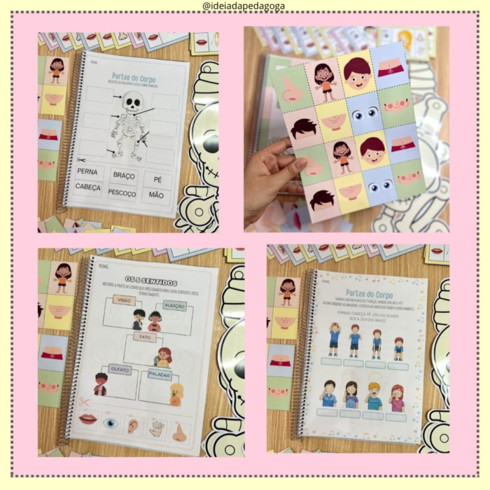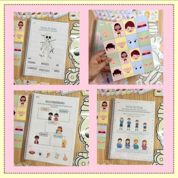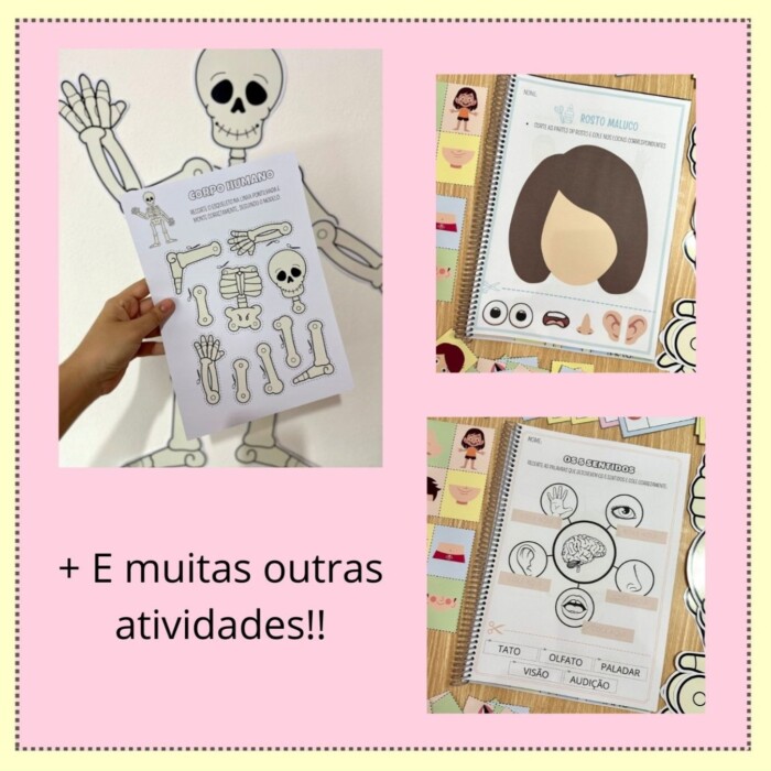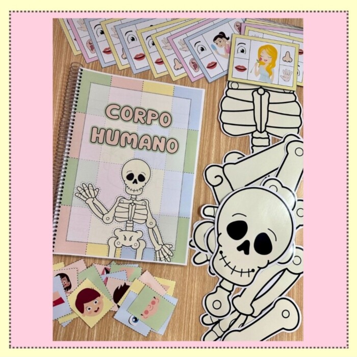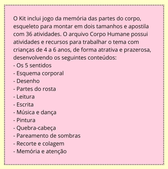 O Kit inclui jogo da memória das partes do corpo, esqueleto para montar em dois tamanhos e apostila com 36 atividades. O arquivo Corpo Humane possui atividades e recursos para trabalhar o tema com crianças de 4 a 6 anos, de forma atrativa e prazerosa, desenvolvendo os seguintes conteúdos: