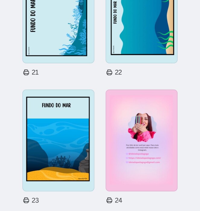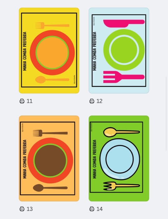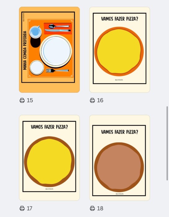 As crianças são convidadas a modelar a massinha diretamente sobre os cards, completando cenários como pizza, fundo do mar e outros contextos visuais atrativos.